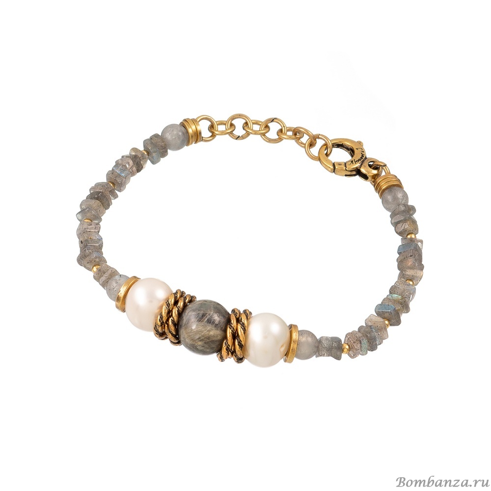 Браслет премиум класса.Браслет с лабрадоритом и жемчугом от итальянского бренда Alcozer&J. В основе браслета — прочный ювелирный сплав с покрытием в оттенке «античное золото». Такая отделка придаёт украшению винтажный шарм и благородство, позволяя гармонично сочетать его как с повседневными образами, так и с вечерними нарядами. Эффектное сочетание натурального лабрадорита с его загадочной игрой света и нежного жемчуга создаёт утончённый акцент на запястье. Надёжный замок-карабин обеспечивает удобство при ношении и безопасность изделия.
