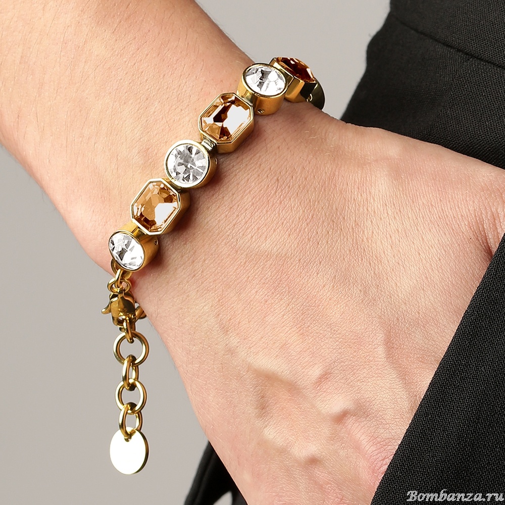 Размер изделия: 17 см + удлинитель Масса изделия: 45 г ALAYA — потрясающий и невероятно гламурный браслет в стиле ар-деко, состоящий из ряда круглых хрустальных шатонов, переплетённых с кристаллами изумрудной огранки. Изготовлен из нержавеющей стали, покрыт и отполирован до совершенства. Представлен в романтичном сочетании персикового и нежно-розового оттенков на золотой основе. ДАТСКИЙ ДИЗАЙН — не содержит кадмия, свинца и никеля.