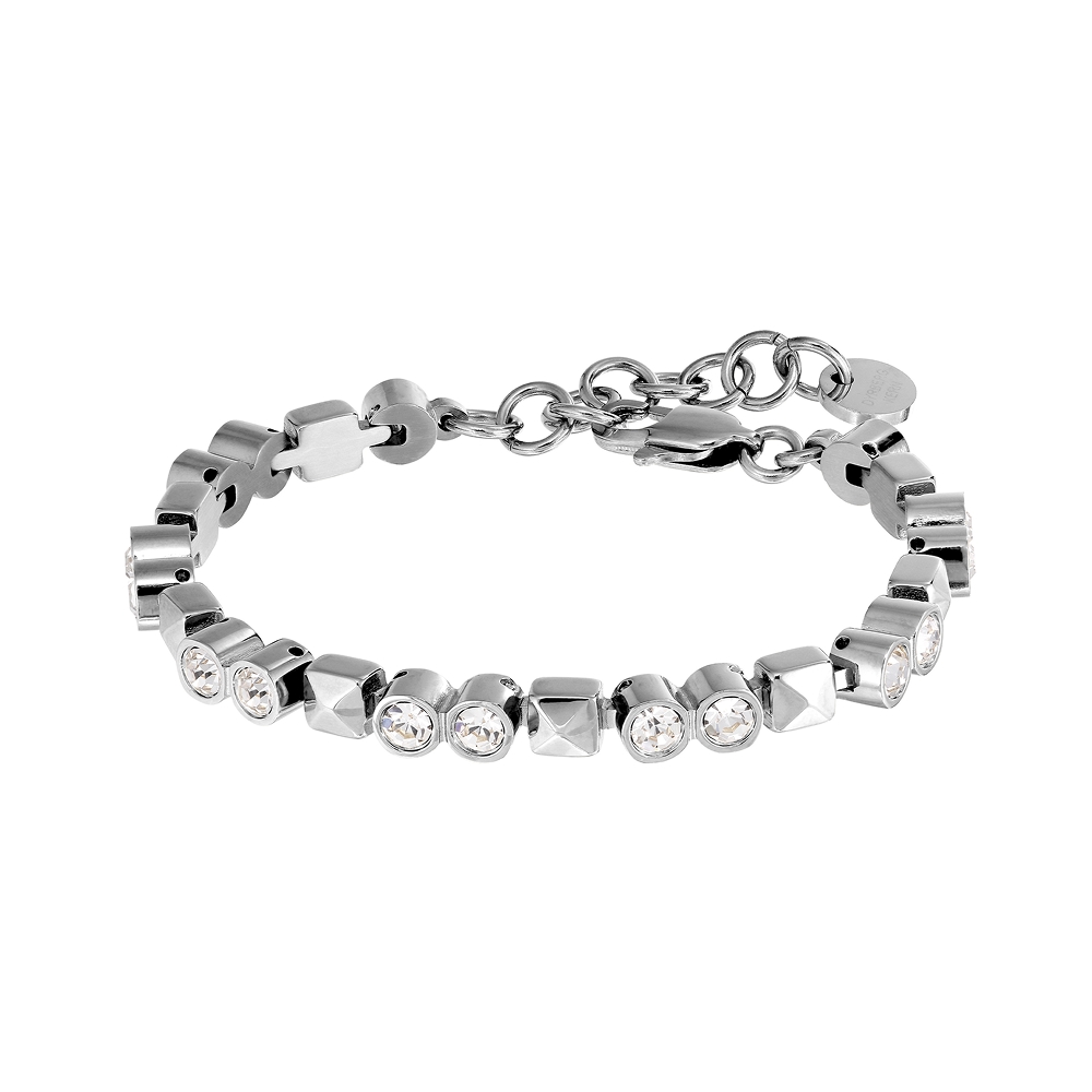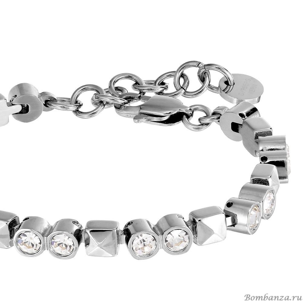 Размер изделия: 17 + 2 см удлинитель Масса изделия: 26 г ROCKSTUD — раскройте свой истинный потенциал рок-звезды: теннисный браслет из полированной нержавеющей стали с серебристым покрытием, стильными заклепками и сверкающими белыми кристаллами. Датский дизайн от DYRBERG KERN. Высокое качество, не содержит никель.
