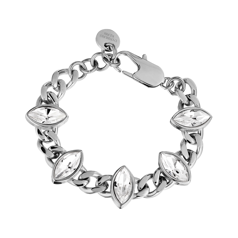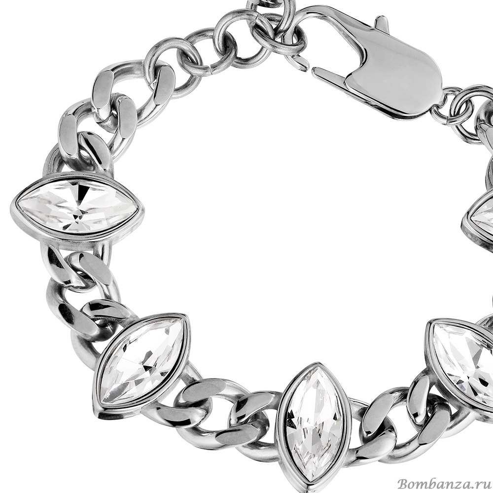 Размер изделия: 17 см + удлинитель Масса изделия: 35 г ZELKO — это версия роскошного браслета с прочной стальной цепочкой и пятью гранёными кристаллами в форме листьев, которые выглядят просто потрясающе. Носите его отдельно или в сочетании с другими браслетами. Представлен в серебристом цвете с красивыми классическими белыми кристаллами. Разработан в Дании, не содержит кадмия, никеля и свинца.