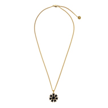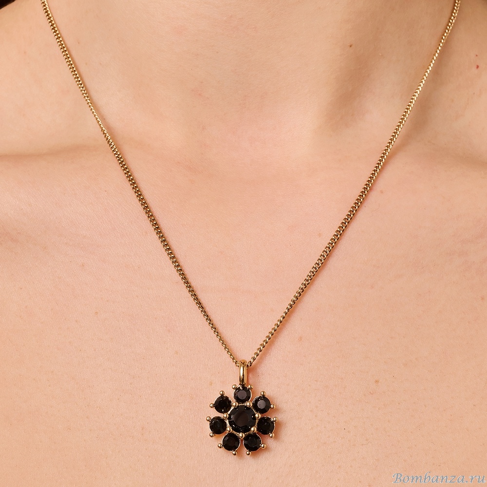 Размер изделия: 42 см + 5 см удлинитель Масса изделия: 10 г DELISE — романтическая цепочка в стиле ретро из нержавеющей стали, украшенная подвеской с цветочным узором из сверкающих кристаллов. Диаметр подвески — 18 мм. Прекрасно смотрится как с простой рубашкой, так и с вечерним платьем. Представлена в варианте с полностью черными кристаллами на золотистой основе. Протестировано на аллергию и разработано в Дании