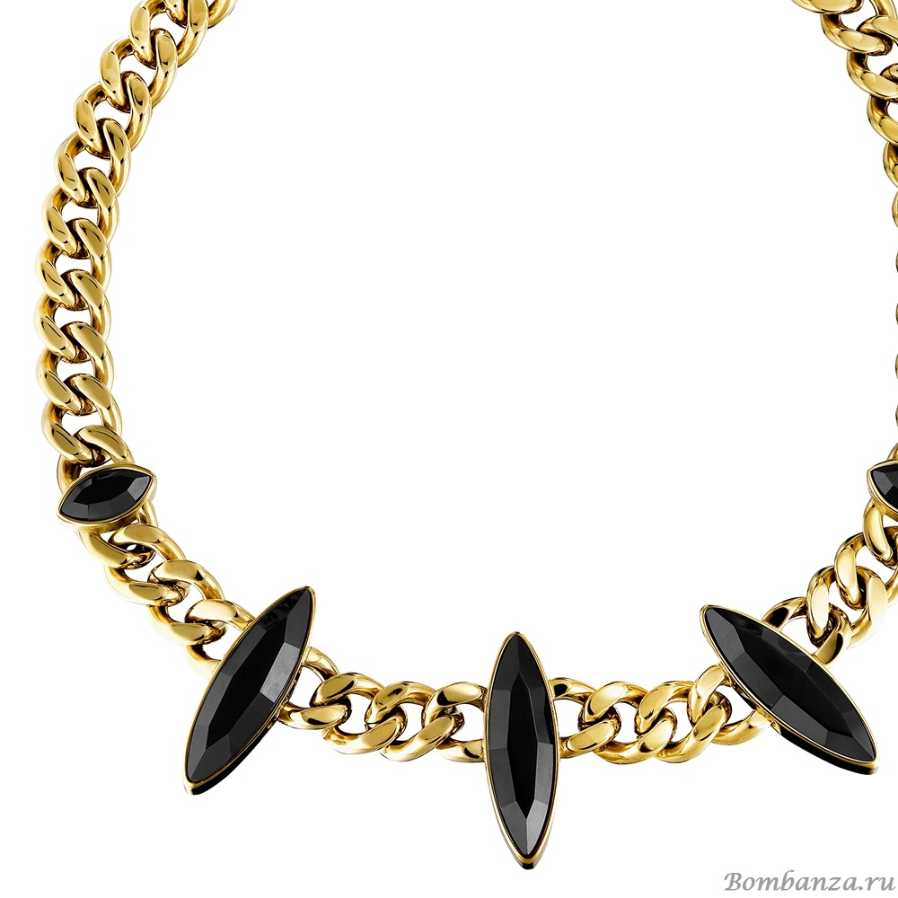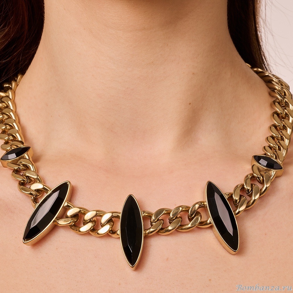 Размер изделия: 45 + 5 см удлинитель Масса изделия: 150 г OPSICA — это массивное короткое колье, которое красиво ложится на шею. Привлекает внимание и в то же время выглядит очень шикарно! Цепочка выполнена из полированной стали, а пять крупных и мелких кристаллов в форме листьев потрясающе красивы. Носите OPSICA с простым топом или вечерним платьем — как вам больше нравится. Здесь представлена версия в золотистых тонах с эффектными угольно-черными камнями. ДАТСКИЙ ДИЗАЙН — без кадмия, свинца и никеля.