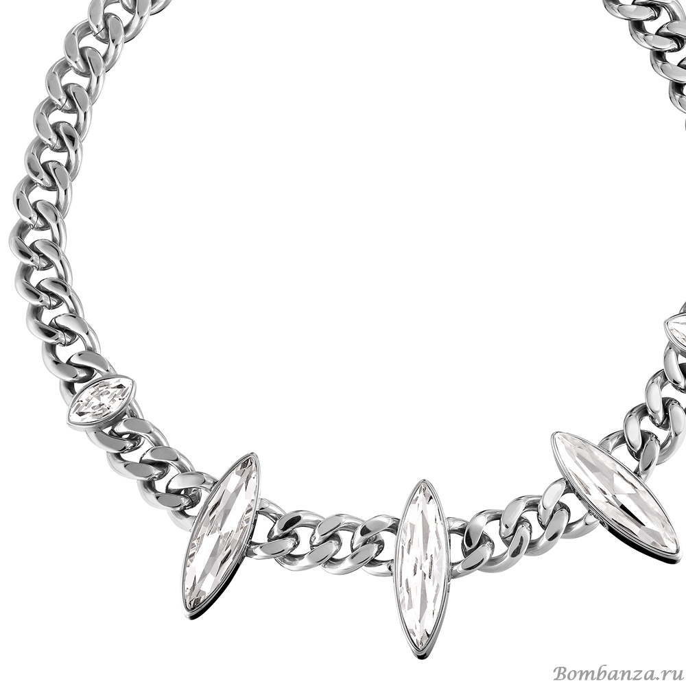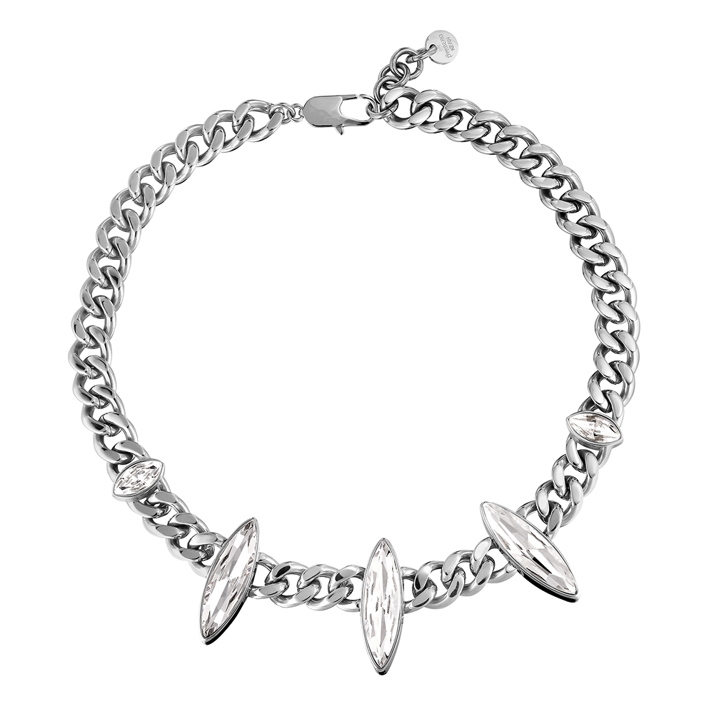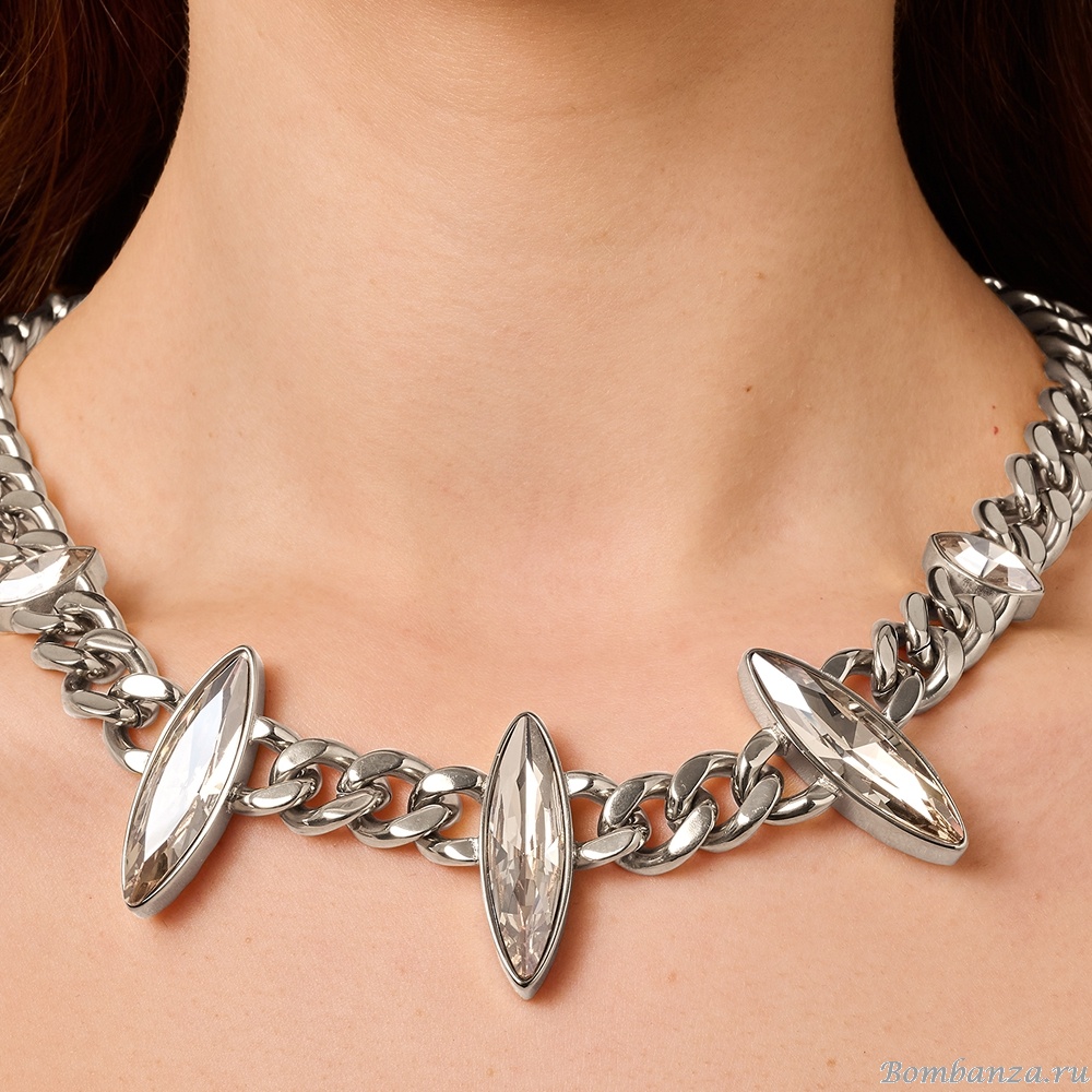 Размер изделия: 42 + 5 см удлинитель Масса изделия: 150 г OPSICA — это массивное короткое колье, которое красиво ложится на шею. Привлекает внимание и в то же время выглядит очень шикарно! Цепочка выполнена из полированной стали, а пять крупных и мелких кристаллов в форме листьев потрясающе красивы. Носите OPSICA с простым топом или вечерним платьем — как вам больше нравится. На фото представлена версия с эффектными белыми кристаллами на серебристой основе. ДАТСКИЙ ДИЗАЙН — без кадмия, свинца и никеля.