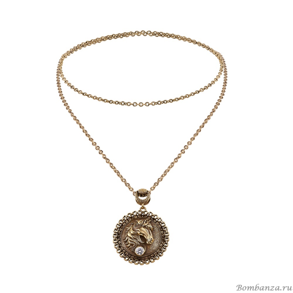 Подвеска ручной работы CAVALLO. Лошадь, это символ жизненной силы, красоты, грациозности, мощи и завораживающего гармоничного движения. Итальянский дизайн. Состав: ювелирный сплав - Brass (латунь), гальваническое покрытие - нанокерамика, патинирование, фианит. Цвет: античное золото, прозрачный. Размер: высота 4,9 см, цепь 70 см. Вес: 22,7 гр. Хранение 1 Храните украшения в специальной шкатулке или в отдельных мешочках, чтобы они не соприкасались друг с другом. 2 Не допускайте контакта украшений с парфюмерией, водой, дезодорантами, маслами, мылом, шампунями и другими химикатами. 3 Снимайте украшения перед любыми водными процедурами, чтобы не повредить покрытие и сохранить их внешний вид. 4 Снимайте украшения перед занятиями спортом и сном. 5 Берегите украшения от случайных или намеренных ударов. Уход 1 Используйте мягкую плотную ткань, такую как микрофибра или фланель, для удаления пыли и загрязнений. 2 Не используйте агрессивные очистители, которые могут повредить декоративное покрытие. 3 Для более глубокой чистки обратитесь в ювелирные мастерские либо пункты ремонта ювелирных украшений.