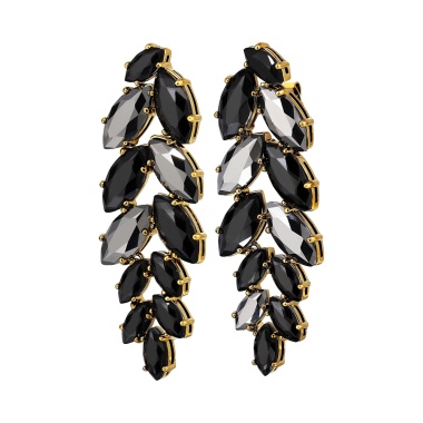 Размер изделия: 6 см Масса изделия: 13,6 г BANYAN — необыкновенные серьги, украшенные не менее чем двенадцатью ограненными кристаллами в форме листьев, образующими непрерывный узор, который создает иллюзию того, что хрустальные лепестки ласкают вашу шею. Поистине великолепный дизайн. Изготовлены из полированной латуни, фиксируются пусетным замком из хирургической стали. Представлены в сочетании черных и серых кристаллов на золотой основе. Датский дизайн, не содержит никеля.