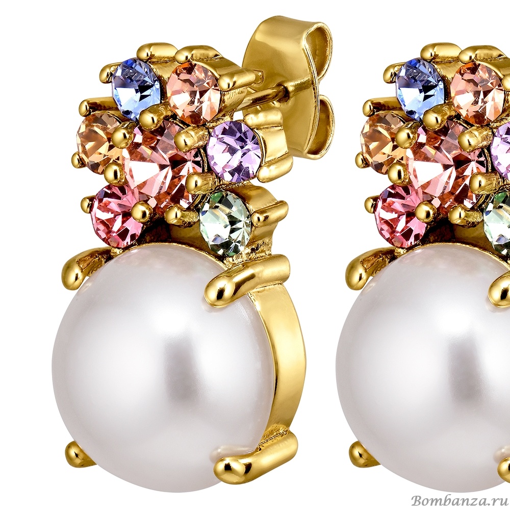 Размер изделия: 2,5 см Масса изделия: 5 г BECKIA — романтическая и привлекающая внимание модель сережек с крупным кулоном из белого искусственного жемчуга в сочетании с верхней частью, украшенной цветочным узором. Необычная и шикарная. Здесь представлено сочетание блестящего золота, белого жемчуга и кристаллов пастельных тонов. ДАТСКИЙ ДИЗАЙН — не содержит кадмия, никеля и свинца.