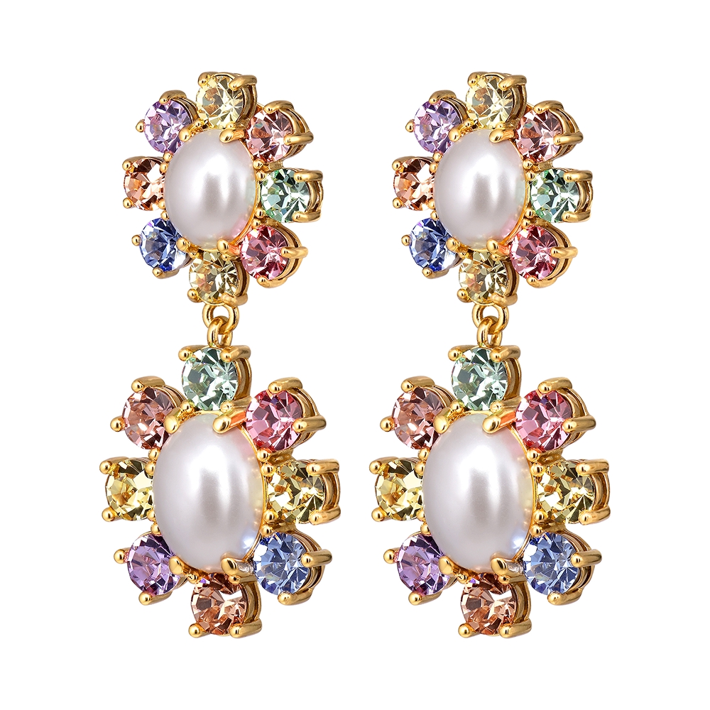 Размер изделия: 5 см Масса изделия: 12 г LINA — это эффектные и гламурные серьги из полированной латуни, вдохновлённые цветочными мотивами. Эта модель в стиле ретро украшена двумя крупными кристаллами, обрамлёнными ещё более сверкающими кристаллами ручной огранки в подходящей или контрастной цветовой палитре. Штифт из хирургической стали. Здесь представлены в золотом цвете и в сочетании светлых пастельных тонов и белого искусственного жемчуга. Датский дизайн без никеля, ручной работы.