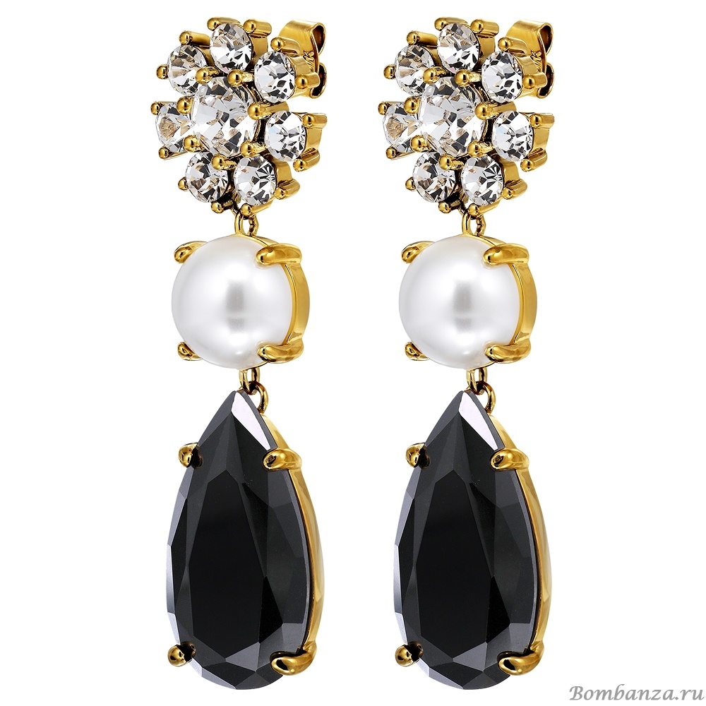 Размер изделия: 4 см Масса изделия: 13 г MISIA — романтичные серьги, полностью украшенные кристаллами, с цветочной верхней частью, средней частью в форме белой искусственной жемчужины и каплевидным кристаллом. Застежка — из хирургической стали, которая надежно фиксирует украшение. Здесь представлено сочетание прозрачного хрусталя, угольно-черного и белого искусственного жемчуга на золотой основе. Красота, сочетающая в себе современность и романтичность, которая так свойственна вам в глубине души. Изготовлена из полированной латуни золотого цвета. Датский дизайн — без никеля. Настоящая красота!