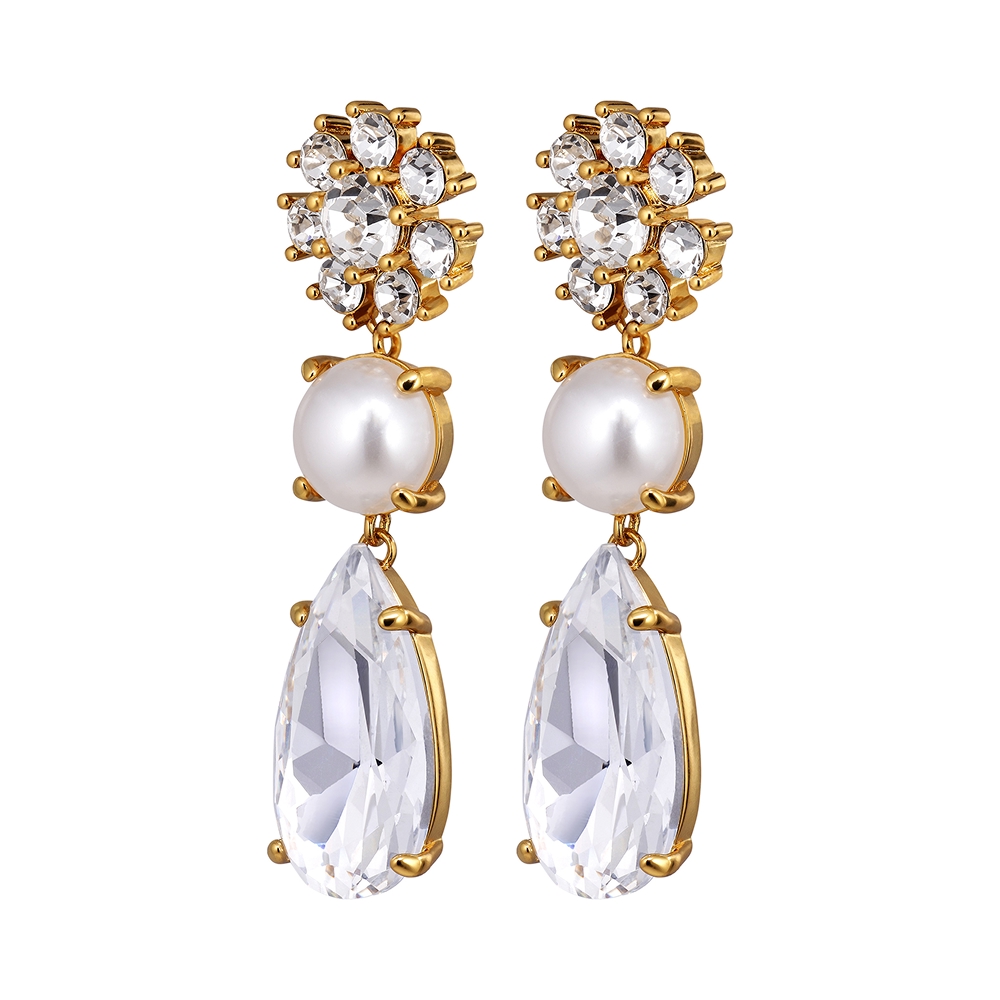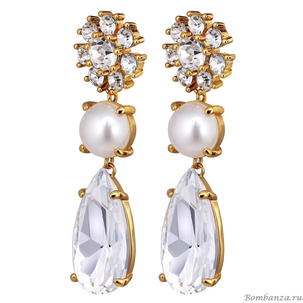 Размер изделия: 4 см Масса изделия: 12 г MISIA — романтические серёжки, полностью украшенные кристаллами, с цветочным верхом, средней частью в форме белого искусственного жемчуга и каплевидным кристаллом. Застёжка — хирургическая сталь, которая надёжно удерживает украшение на месте. Здесь представлены в пастельном, серебристом и белом жемчужном варианте. Красота, сочетающая в себе современность и романтичность, которая у вас есть в глубине души. Изготовлены из полированной латуни в золотом цвете. Датский дизайн — без никеля. Настоящая красота!