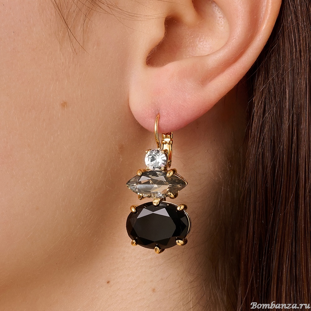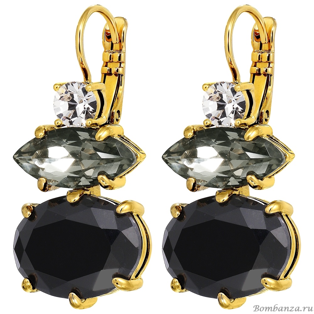 Размер изделия: 3 см Масса изделия: 7 г PARSANA — это декоративные женские серьги с закрытой застёжкой из хирургической стали. Три гранёных кристалла создают красивую игру цвета, в данном случае — таинственное сочетание чёрного, серого и белого оттенков на золотистой основе. Дизайн выполнен в Дании и, конечно же, не содержит никеля